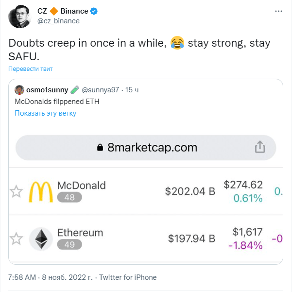 Драма с FTX не осталась незамеченной на рынке криптовалют, сказавшись падением цены главной криптовалюты биткоин и альткоина номер один Ethereum. После движения ниже $ 1500 рыночная капитализация Ethereum снова уступила аналогичному показателю McDonald’s.