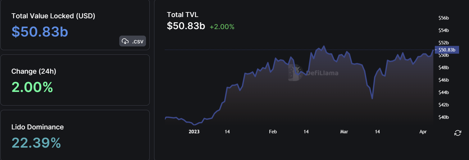 По состоянию на 5 апреля показатель TVL составил $50,8 млрд, что практически равно годовому максимуму $51,4 млрд.