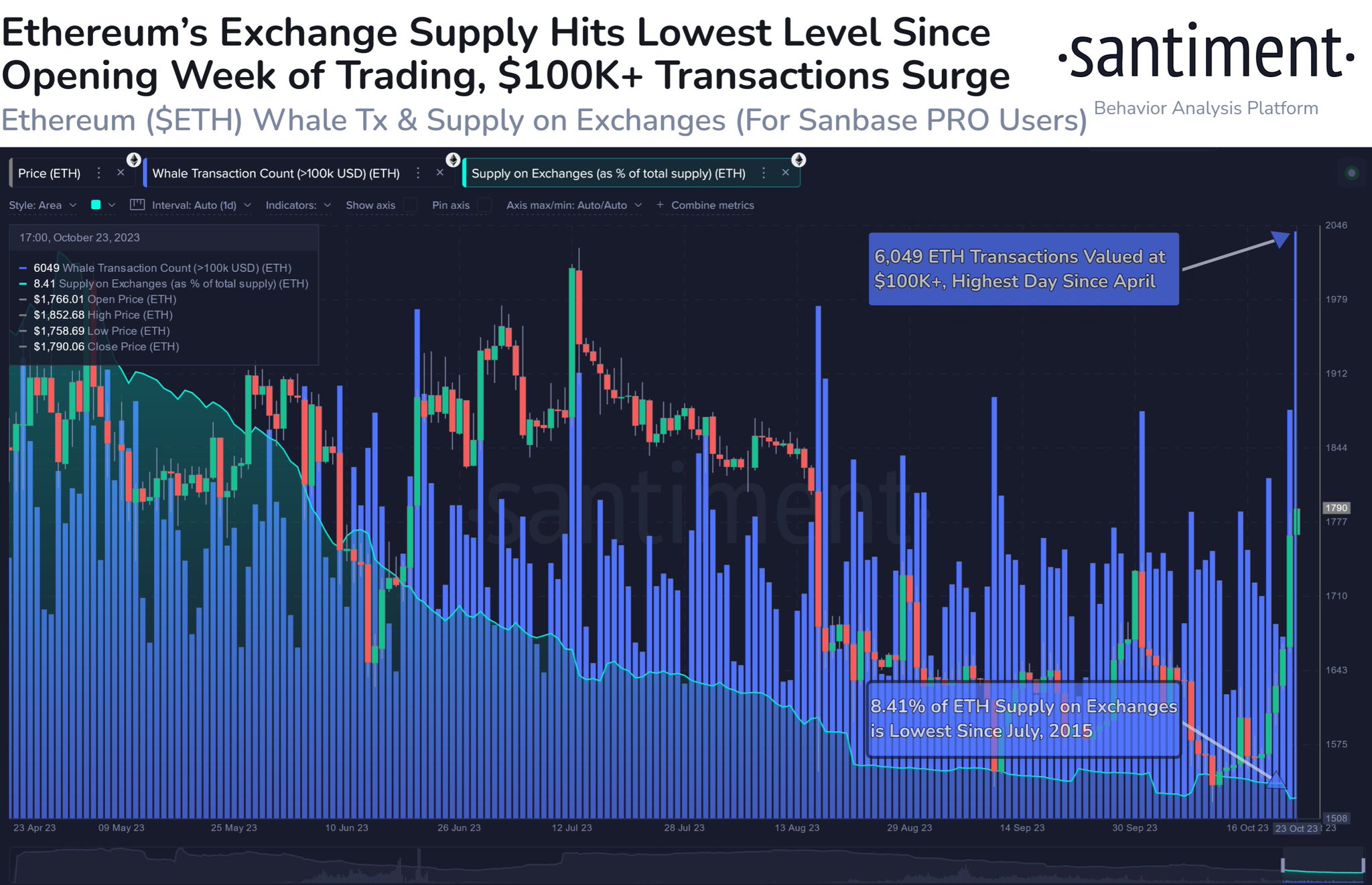 Взлет ETH сопровождается высокой активностью крупных инвесторов. Компания Santiment зафиксировала более 6000 транзакций на эфириуме на суммы не менее $100 000.