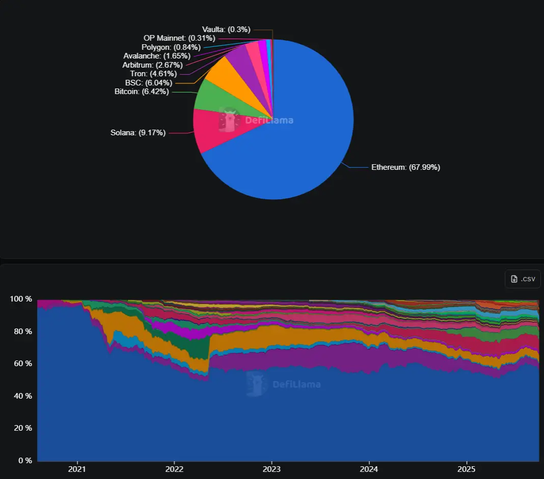 Хотя доминирование Ethereum в DeFi снизилось с 2021 года, он остается ведущей платформой в этом секторе. Источник: DefiLlama