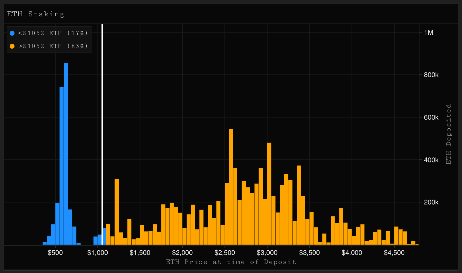 Основатель Parsec Finance Уилл Шихан поделился данными о стейкерах ETH с точки зрения цены входа. На графике показано, что только 17% игроков имеют статус «в прибыли», при этом большинство игроков (875) терпят огромные убытки.