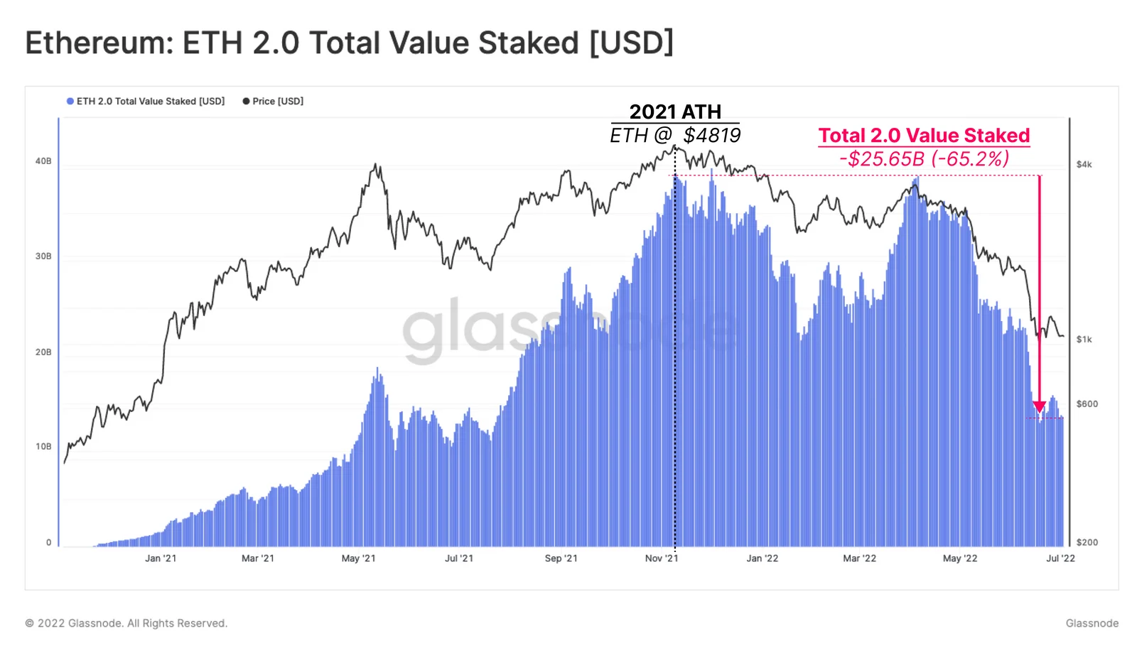Постоянный приток монет от инвесторов, желающих стать валидаторами, наблюдается с момента запуска разработчиками сети Beacon в ноябре 2020 года. Общее количество заблокированных ETH в настоящее время достигло 12,98 млн, что составляет более 10,9% оборотного предложения. 62% этой суммы было отправлено до достижения исторического максимума (ATH) цены актива в ноябре 2021 года, а оставшиеся 38% были отправлены уже после. На ноябрьском ATH, когда ETH стоил $4819, общая стоимость депозитов в стекинге достигла 39,7 млрд долларов, что соответствует 263 918 валидаторам сети. Однако после ATH стоимость упала на 25,65 млрд долларов. Несмотря на падение рынка, инвесторы отправили в стекинг еще около 5 миллионов ETH, а количество валидаторов увеличилось до 406 047 единиц