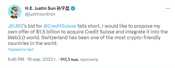 Основатель Tron Джастин Сан провозгласил идею о том, что если испытывающего трудности финансового гиганта Credit Suisse не приобретёт UBS, то он купит его, чтобы превратить в дружественный криптовалютам банк.