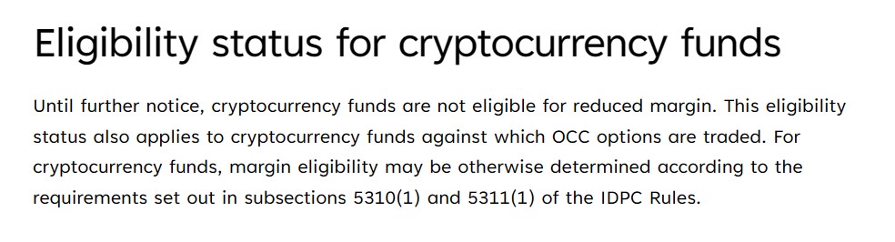 В своем объявлении CIRO заявила, что криптовалютные фонды не имеют права на пониженную маржу «до дальнейшего уведомления». В результате инвесторам, торгующим криптовалютными фондами, необходимо будет поддерживать более высокое обеспечение, что делает использование позиций криптовалюты более дорогим по сравнению с акциями или биржевыми фондами (ETF).