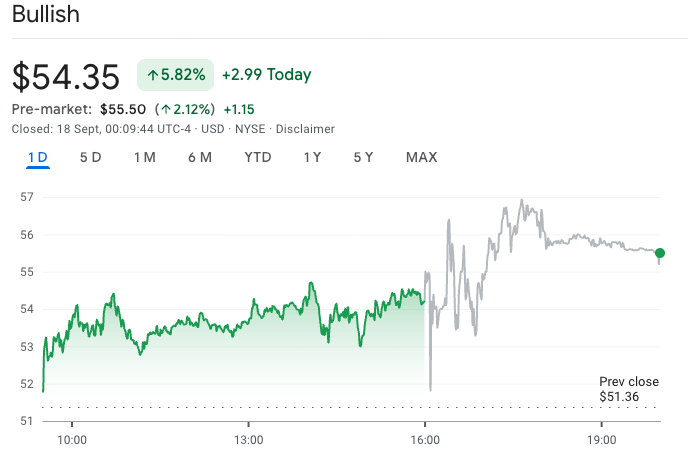 Bullish стала публичной компанией в середине августа через размещение на Нью-Йоркской фондовой бирже. Несмотря на снижение более чем на 20% с момента закрытия первого дня торгов на отметке $68, текущая цена акций остается на 47% выше уровня IPO в $37.