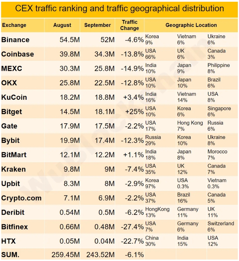 В общей сложности трафик в сентябре на криптобиржах сократился на 6% по сравнению с августом. Прирост был отмечен на Bitget (+25%), KuCoin (+3%) и BitMart (+1,1%), наибольшая убыль — у Bitfinex (-27%), HTX (-23%) и MEXC (-15%).