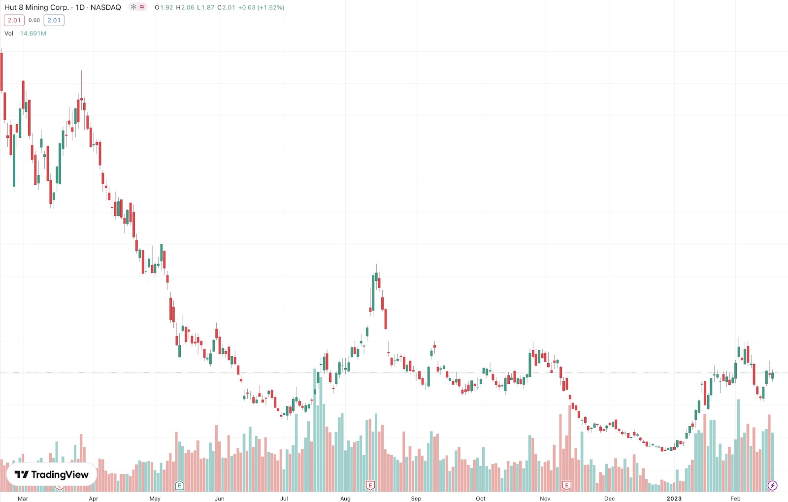 Динамика котировок ценных бумаг Hut 8 с февраля 2022 г. по февраль 2023 г. Источник: TradingView