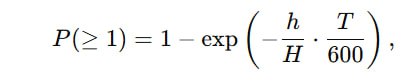 Он объяснил, что вероятность события за ограниченный промежуток времени можно рассчитать по формуле, где h — хешрейт майнера, H — хешрейт сети, 600 секунд — средний интервал между блоками:
