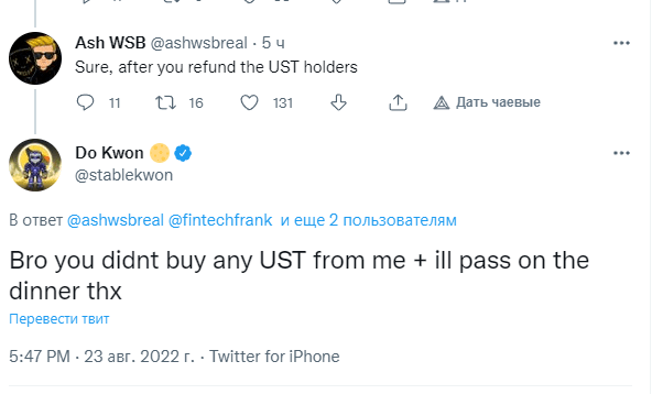 В разговор вмешался известный в сфере криптовалюты человек по прозвищу Ash WSB, который потребовал, чтобы Квон сначала выплатил компенсацию инвесторам UST.