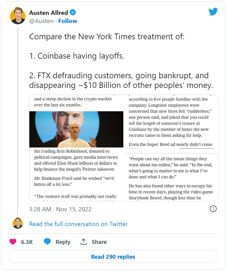 Глава Bloom Institute of Technology Остин Оллред обратил внимание, что ранее NYT использовала гораздо более жесткую риторику, описывая сокращение штата криптобиржи Coinbase. Интервью с Бэнкманом-Фридом при этом было скорее комплементарным, хотя в его случае речь идет об исчезновении порядка 10 млрд долларов клиентов.