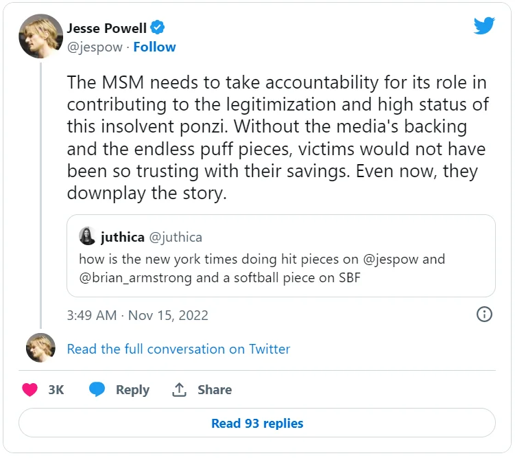 Кто еще раскритиковал статью? Глава криптобиржи Kraken Джесси Пауэлл заявил, что доверие пользователей к FTX во многом было основано на информационной поддержке биржи со стороны СМИ, которые даже сейчас преуменьшают значимость ее банкротства. Он добавил: