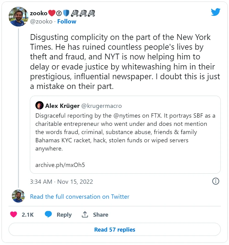 Разработчик анонимной криптовалюты Zcash Зуко Вилкокс считает, что NYT, будучи влиятельной газетой, за счет публикации обеляющей статьи помогает Бэнкману-Фриду отсрочить судебное разбирательство или вовсе его избежать. Он подчеркнул, что мошенничество и воровство основателя FTX «разрушило жизни бесчисленного множества людей».