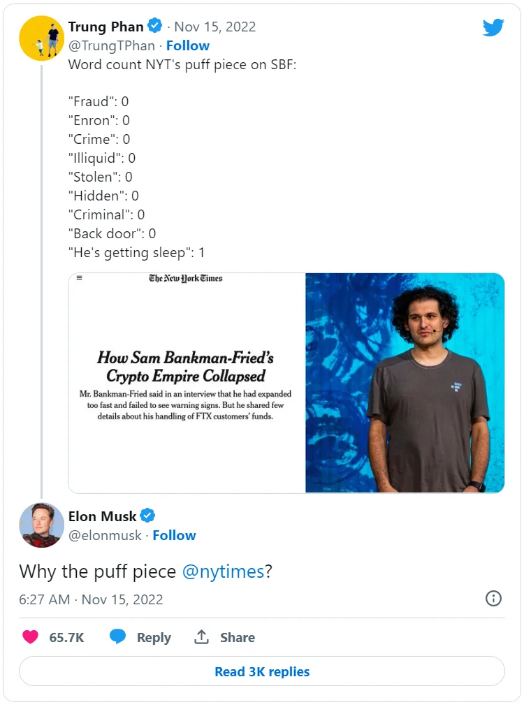 Что произошло? 14 ноября газета New York Times опубликовала интервью с бывшим главой обанкротившейся криптобиржи FTX Сэмом Бэнкманом-Фридом. В нем предприниматель согласился с критикой криптосообщества относительно стремительного расширения деятельности группы компаний FTX Group за счет сделок по финансированию и покупке других проектов. Бэнкман-Фрид добавил, что это не позволило ему вовремя отследить проблемы, с которыми столкнулась биржа. Комментируя это интервью в Twitter, глава Tesla и SpaceX Илон Маск поинтересовался у редакции, зачем она публикует заказные статьи. С такой оценкой материала согласились и многие представители криптоиндустрии, указав на отсутствие острых вопросов и подробностей обращения со средствами пользователей.