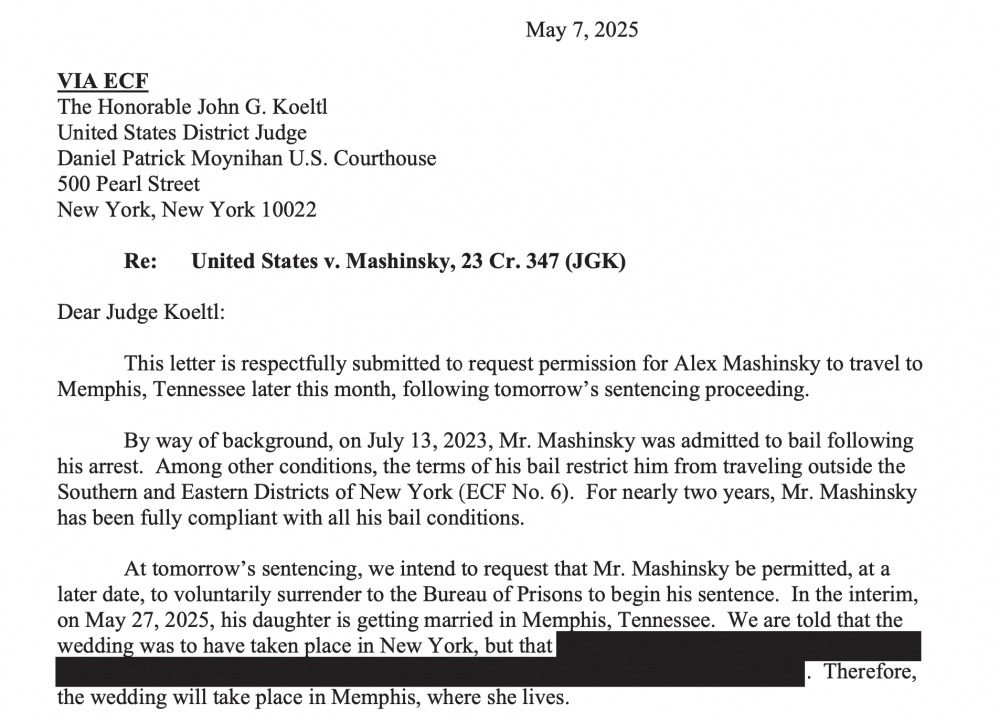 В заявлении от 8 мая в Окружной суд США по Южному округу Нью-Йорка судья Джон Коелтл одобрил ходатайство Машинского о поездке из Нью-Йорка в Мемфис, штат Теннесси, в период с 26 по 29 мая на свадьбу его дочери. Одобрение было доступно в публичном списке по состоянию на 8 мая, но, по-видимому, было удалено на момент публикации.