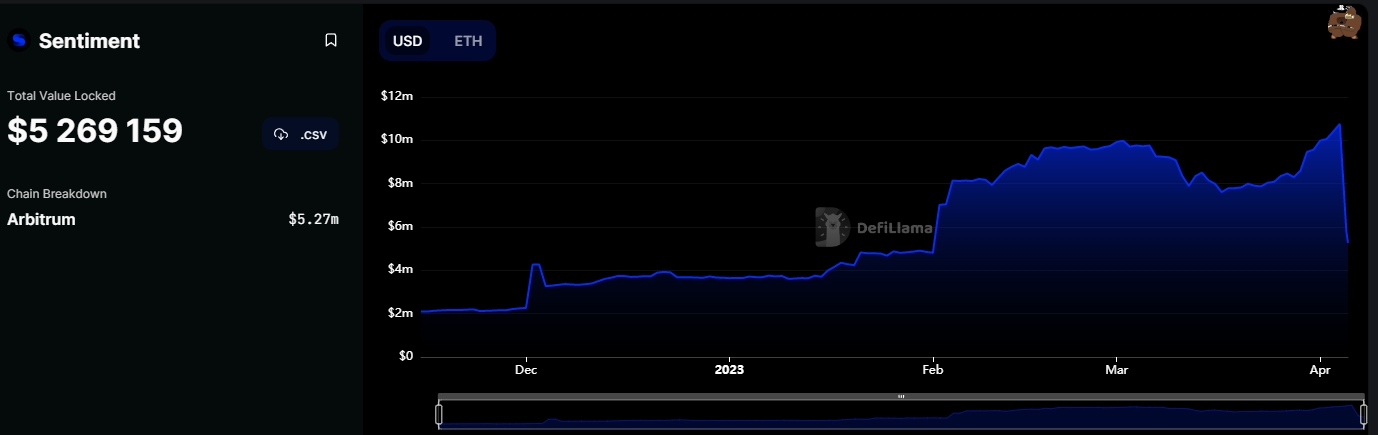 По данным DeFi Llama, на фоне взлома стоимость заблокированных в Sentiment активов обвалилась практически вдвое — с $10,78 млн до $5,27 млн.