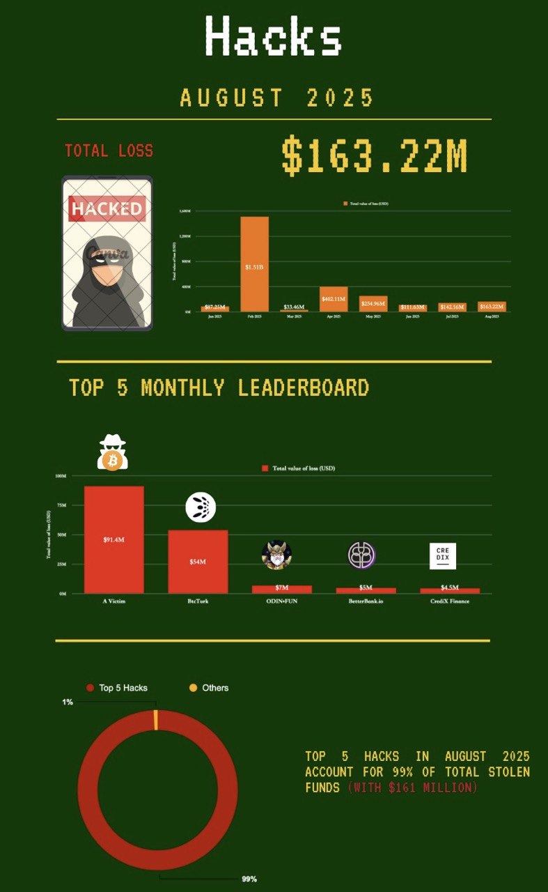 В августе в результате 16 крупных взломов хакеры похитили криптовалюту на сумму $163 млн, сообщили аналитики PeckShield. Месяцем ранее сумма была на 15% меньше — $142 млн.