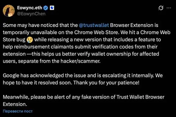 Генеральный директор Trust Wallet Эовин Чен (Eowyn Chen) в четверг, 1 января, сообщила, что браузерное расширение сервиса временно недоступно в Chrome Web Store. Новая версия расширения будет включать функцию, которая позволит пострадавшим отправлять коды верификации напрямую через расширение. Без прохождения верификации получить потерянные деньги в ходе хакерской атаки деньги будет невозможно.