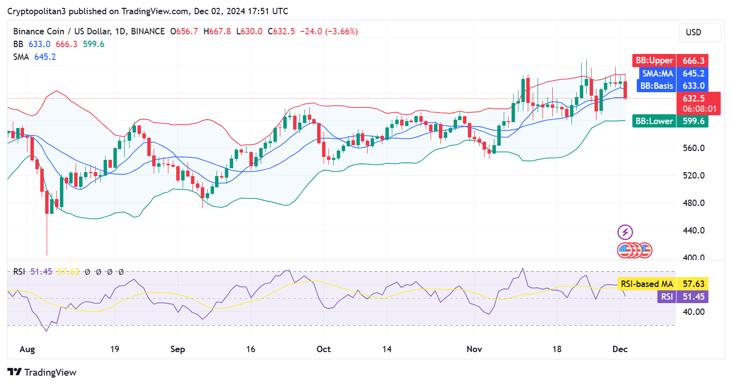 - في نوفمبر، ارتفع سعر BNB إلى 661 دولارًا أمريكيًا، وفي بداية ديسمبر 2024، يتم تداوله بالقرب من نطاق 650 دولارًا أمريكيًا.
