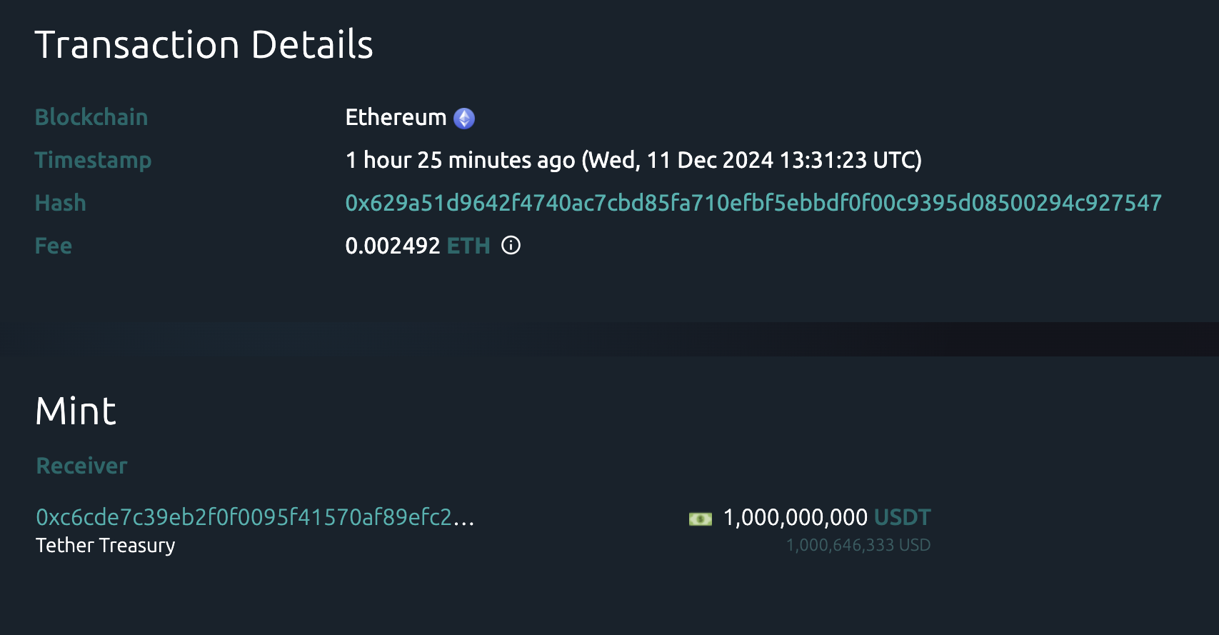 وفقًا لبيانات جديدة على السلسلة، قامت تيثر للتو بسك رموز USDT بقيمة 1 مليار دولار. الشركة كانت تقوم مؤخرًا بالسك بكميات ضخمة، معلنة عن أرباح قياسية في الربع الثالث من 2024.