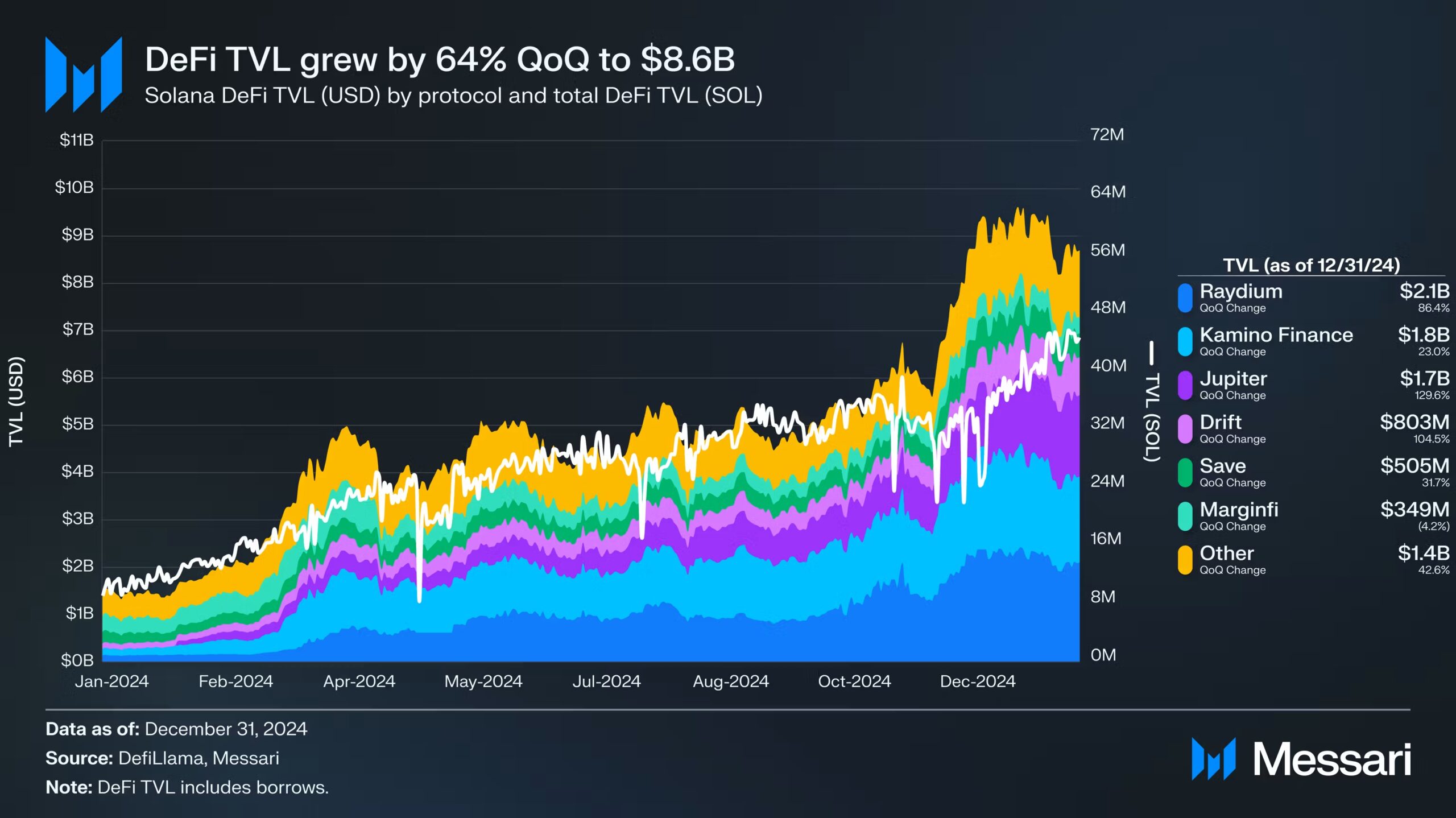 فيما يتعلق بالتمويل اللامركزي (DeFi)، ارتفع إجمالي القيمة المقفلة (TVL) على سولانا بنسبة 64% مقارنة بالربع السابق، ليصل إلى 8.6 مليار دولار، متجاوزًا شبكة ترون Tron في نوفمبر، ما جعلها ثاني أكبر شبكة DeFi بعد إيثيريوم. وعند احتساب القيمة المقفلة بعملة SOL، ارتفعت بنسبة 28% إلى 46 مليون SOL.