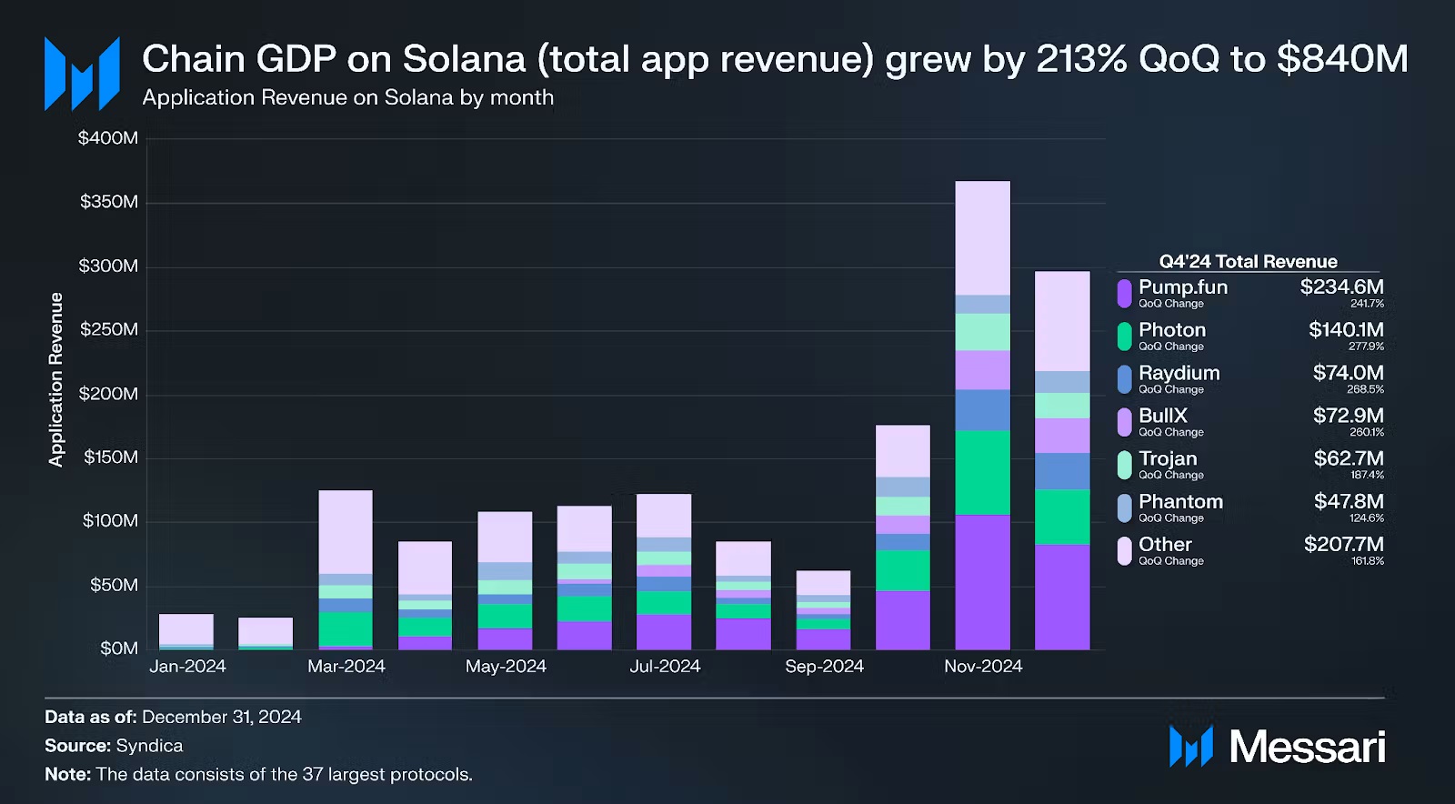 شهدت شبكة سولانا (SOL) أداء استثنائي خلال الربع الرابع من عام 2024، حيث أظهر تقرير من شركة الأبحاث Messari أن هذا الربع قد يكون الأفضل في تاريخ أي شبكة بلوكتشين. وارتفعت الإيرادات الإجمالية للتطبيقات لتصل إلى 840 مليون دولار، بعد أن كانت 268 مليون دولار في الربع الثالث. وكان شهر نوفمبر الأكثر تحقيقًا للإيرادات، حيث سجل 367 مليون دولار.