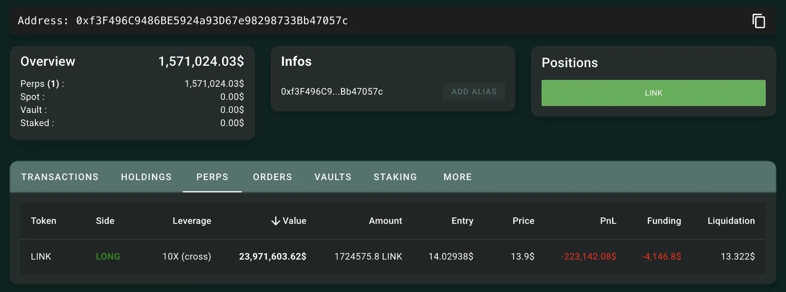في يوم الجمعة ، افتتح المتداول موقعًا طويلًا بقيمة 31،000 دولار على الارتباط باستخدام رافعة 10x ، ووضع التداولات على Hyperleliquid و GMX. اشترى المستثمر رابط 863174 مقابل 12.1 مليون دولار أمريكي ، وقام لاحقًا بتبادلهم لـ StableCoins قبل ساعات من تنفيذ الصفقات الطويلة.