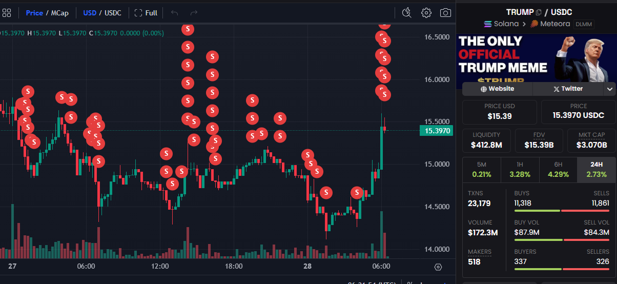 يمر ترامب بأكثر فترة التداول نشاطًا منذ 20 يناير ، مباشرة بعد إطلاق الرمز المميز. في الأسبوع الماضي ، استعادت أحجام التداول ما بين 1.5 مليار دولار و 3 مليارات دولار في 24 ساعة. بعد تجديد مصلحة التداول ، عاد ترامب إلى 14.64 دولار ، حيث بلغت ذروتها لفترة وجيزة من 15.50 دولار.