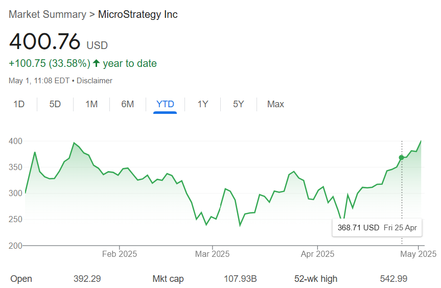 ارتفع MSTR بنسبة 33.75 ٪ في العام حتى الآن ، وتداول عند 400.72 دولار. بلغت الأسهم ذروتها لفترة وجيزة عند 401.10 دولار. في أبريل ، حقق MSTR أكبر مكسب له منذ نوفمبر 2024 ، حيث استعاد الضجيج من رالي BTC Bull السابق. أشار مايكل سايلور ، الرئيس التنفيذي للاستراتيجية ، إلى أن MSTR قد تفوقت حتى الآن إلى جانب BTC.