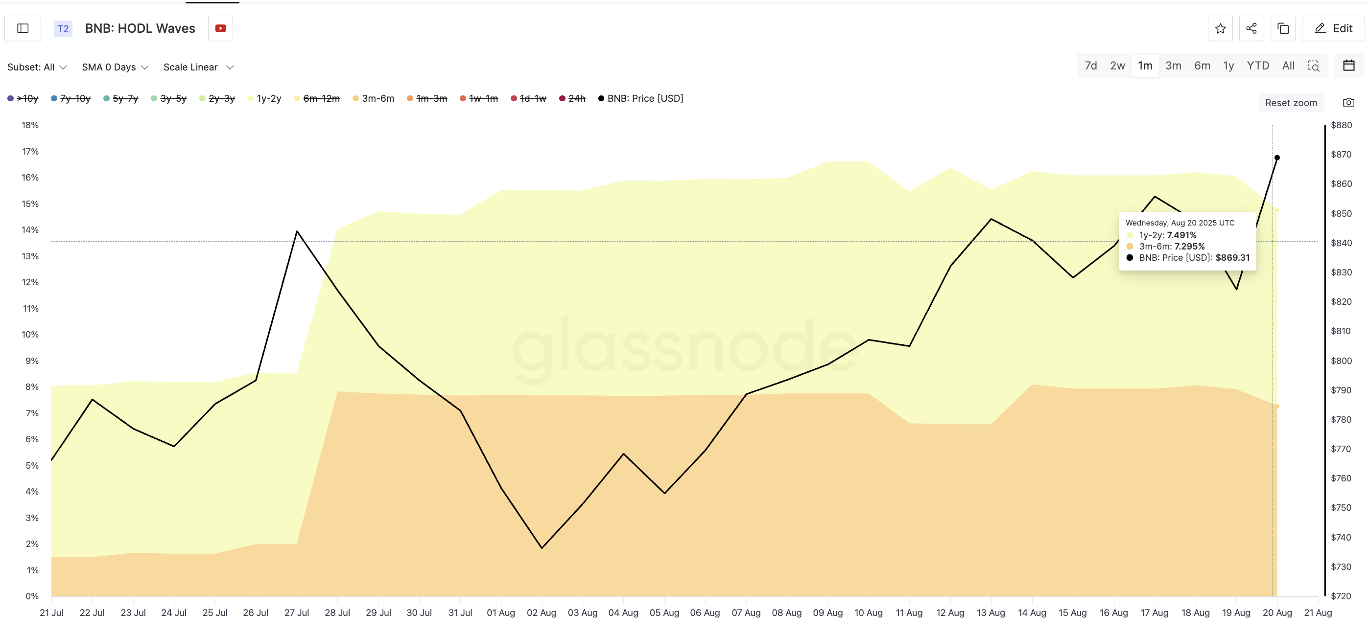 في 21 يوليو، كانت الفئة العمرية 1–2 سنوات تحتفظ بنسبة 6,56% فقط من العرض. نما هذا الرقم إلى 7,49% اعتبارًا من 20 أغسطس. وبالمثل، ارتفعت الفئة العمرية 3–6 أشهر من 1,5% إلى 7,3%. هذه زيادات كبيرة، خاصة عندما ارتفع سعر BNB خلال نفس الفترة.