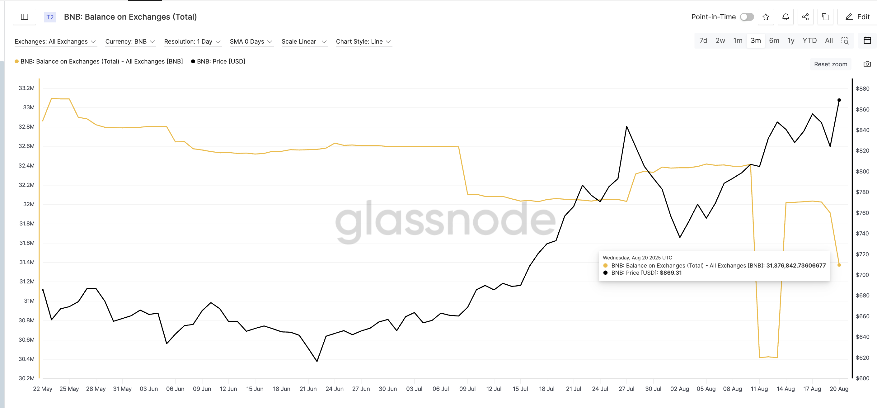 انظر الآن إلى أرصدة البورصات. بين 19 و20 أغسطس، قفز سعر BNB من 824 دولارًا إلى 869 دولارًا. خلال نفس الفترة، انخفضت أرصدة البورصات من 31,91 مليون إلى 31,38 مليون BNB — انخفاض بمقدار 530,000 رمز في يوم واحد.