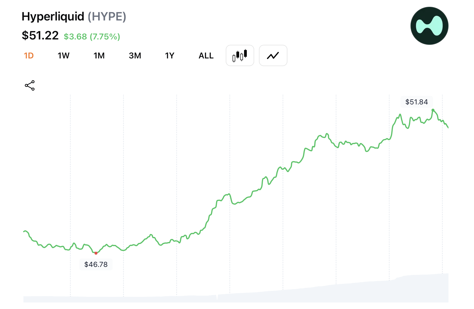 وسط المنافسة لتأمين دور في توفير بنية تحتية مستقرة لعملة USDH، ارتفع الرمز الأصلي لشركة Hyperliquid والذي يسمى HYPE إلى قمة قياسية تقارب 51.84 دولارًا لكل عملة.