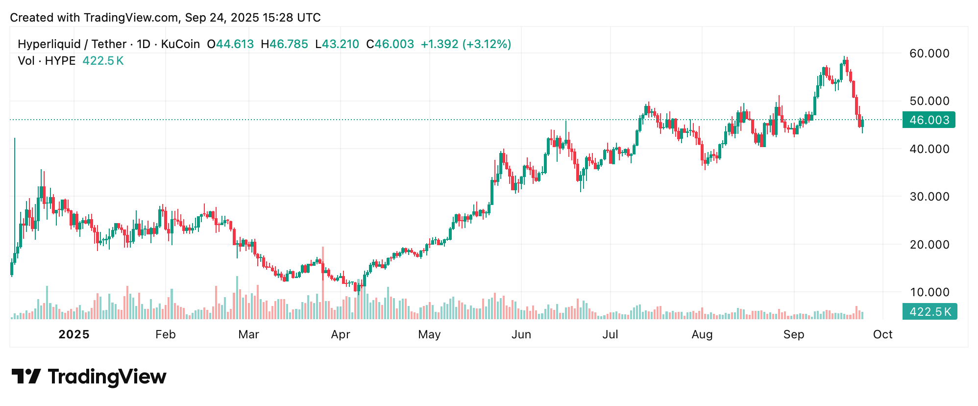 تعد HYK (HYPE) من التذاكر الساخنة على الرادار. تشبه ASTER، HYK هي الشريان الحياة لـ Hyperliquid’s DEX الذي يقود بالعقود والتداول، وتعمل في إطار الحوكمة، ووضع الرهان، وبرامج المكافآت. أخذت HYPE فترة من الراحة بعد الوصول إلى رقمها القياسي البالغ 59.30 دولار في 18 سبتمبر، وانزلقت إلى نطاق سبعة أيام من 43.6 إلى 59.1 دولار وتدور اليوم في منتصف الـ40. دور الملاحظة تحول الآن نحو ASTER، بينما يراقب المتداولون تقويم الإمدادات المعلقة لـHYPE.