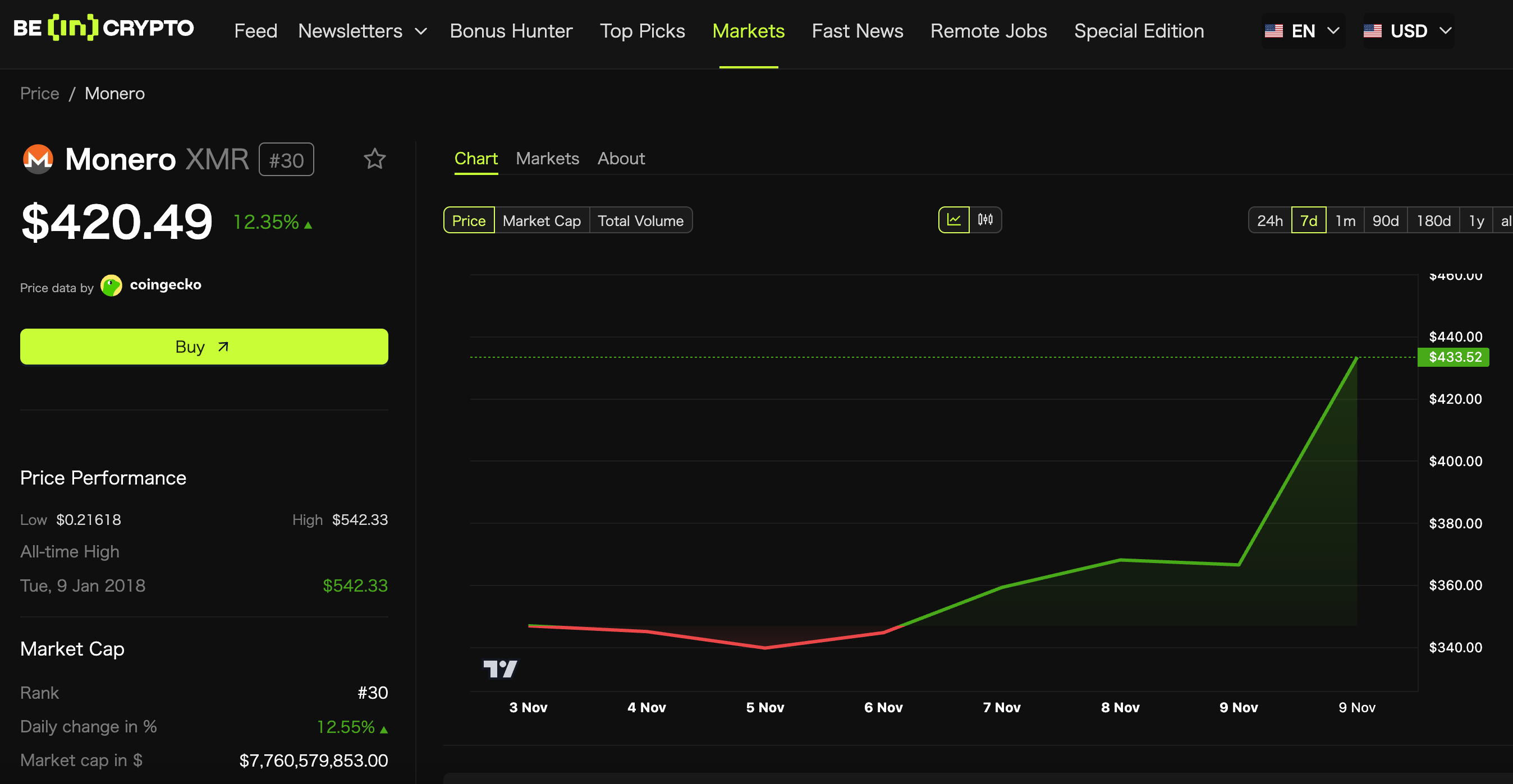 ارتفعت العملة الرقمية المهتمة بالخصوصية مونيرو (XMR) بحوالي 20% خلال الأسبوع الماضي، من سعر $352 في 3 نوفمبر إلى أعلى مستوى مؤقت عند $433.