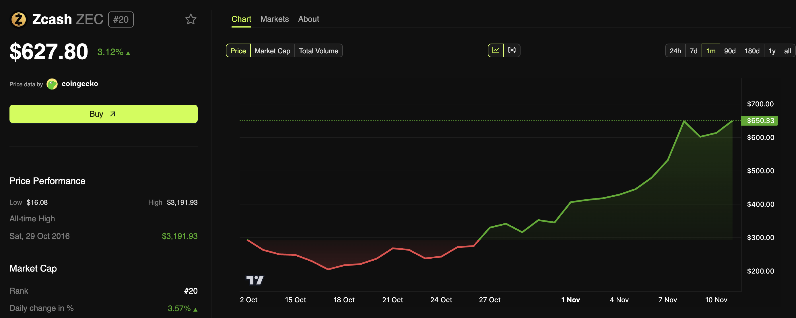 ترتيب زكاش حالياً كأفضل عملة أداءً في الـ90 يومًا الماضية. وفي وقت النشر، كانت تتداول بسعر 627 دولاراً، مرتفعةً أكثر من 3% خلال اليوم الماضي.