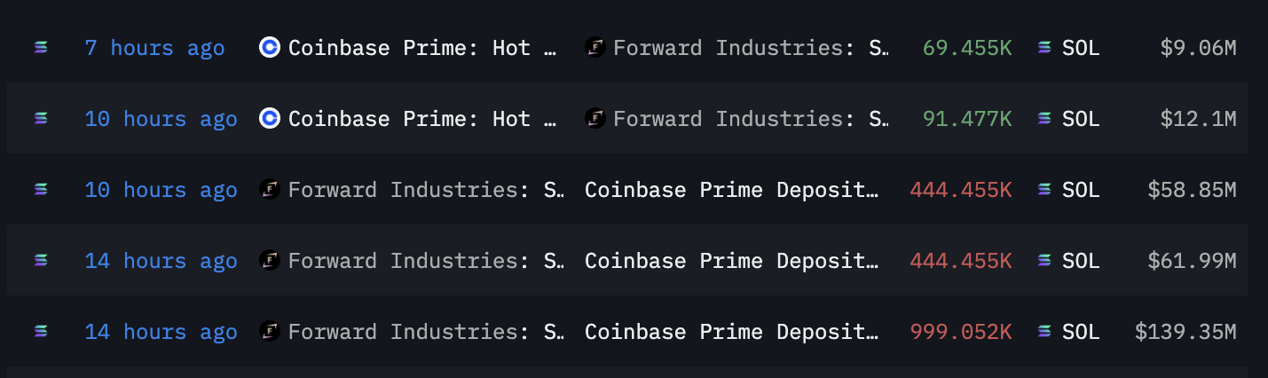 في نفس الوقت، لاحظ المحللون تحركات كبيرة من محافظ فوروارد إندستريز. ووفقًا لبيانات من Arkham Intelligence، قامت الشركة بتحويل ١٬٨ مليون SOL تُقدر بحوالي ٢٣٧٬٦ مليون دولار بأسعار السوق الحالية إلى Coinbase Prime. تم تنفيذ التحويل من خلال ثلاث عمليات نقل منفصلة.