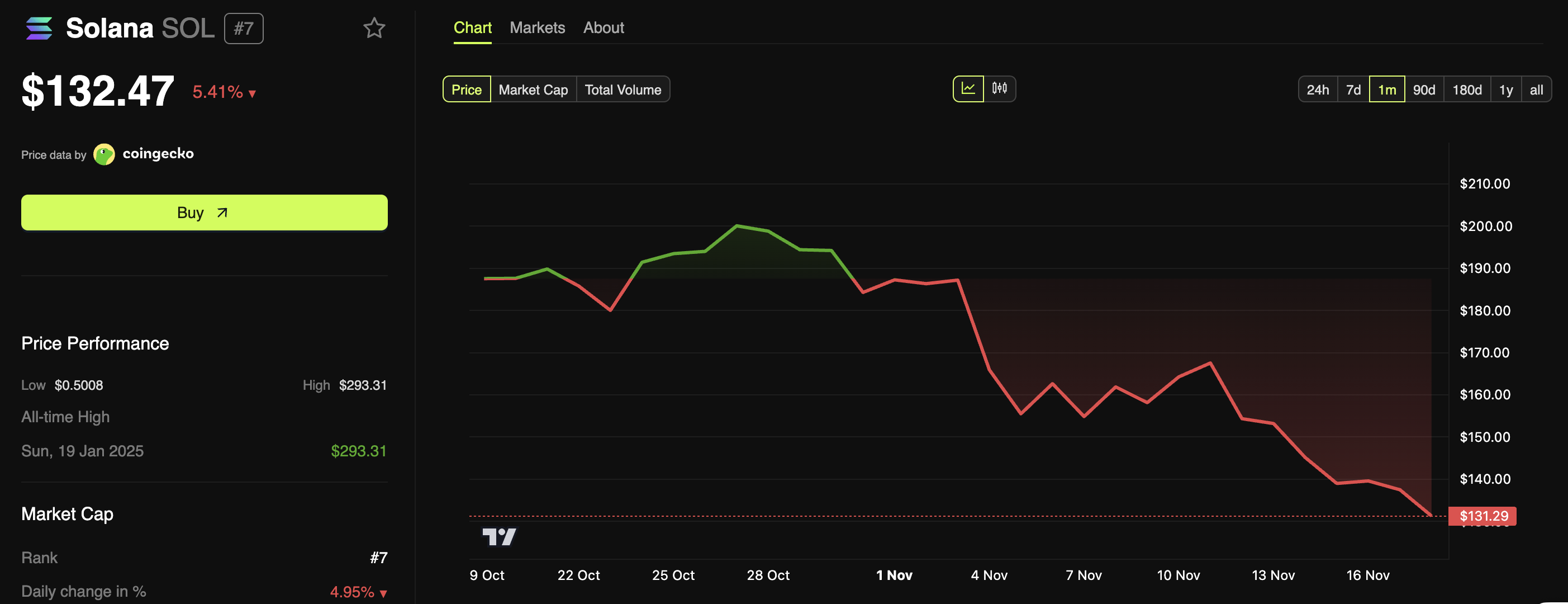تراجع العملة البديلة إلى مستويات لم تشهدها منذ أواخر يونيو. في وقت صدور الصحافة، تم تداول SOL عند $132٬47، مسجلًا انخفاضًا بنسبة %5٬4 خلال الـ 24 ساعة الماضية.