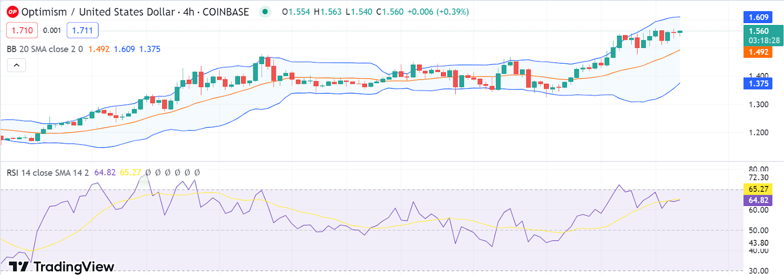 يقع نطاق بولينجر حاليًا عند 1.492 دولارًا أمريكيًا، ويقع النطاق العلوي حاليًا عند 1.609 دولارًا أمريكيًا، ويقع النطاق السفلي عند 1.375 دولارًا أمريكيًا، مما يشير إلى أن السعر قد يتحرك للأعلى في الأيام المقبلة. يُظهر مؤشر القوة النسبية (RSI) إشارات إيجابية، مما يشير إلى أن سعر OP في اتجاه صعودي.