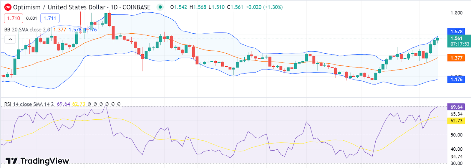 يقع نطاق بولينجر حاليًا عند 1.492 دولارًا أمريكيًا، ويقع النطاق العلوي حاليًا عند 1.609 دولارًا أمريكيًا، ويقع النطاق السفلي عند 1.375 دولارًا أمريكيًا، مما يشير إلى أن السعر قد يتحرك للأعلى في الأيام المقبلة. يُظهر مؤشر القوة النسبية (RSI) إشارات إيجابية، مما يشير إلى أن سعر OP في اتجاه صعودي.
