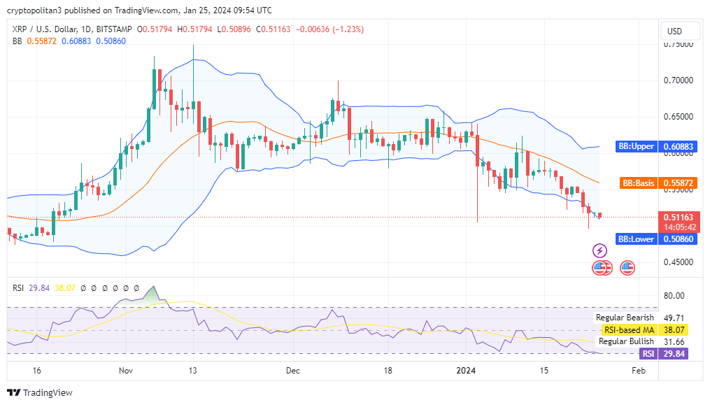 يؤكد أحدث تحليل لأسعار $XRP ليوم واحد وأربع ساعات بتاريخ 25 يناير 2024 علامات الاتجاه الهبوطي الشديد. ويغطي السعر مساراً تنازلياً منذ الأسابيع القليلة الماضية بشكل مستمر. اليوم، تم تسجيل اتجاه هبوطي آخر حيث تدهورت قيمة العملة إلى ما دون هامش 0.512 دولار. ومن المتوقع أن يشتد الاتجاه الهبوطي المستمر في المستقبل القريب.