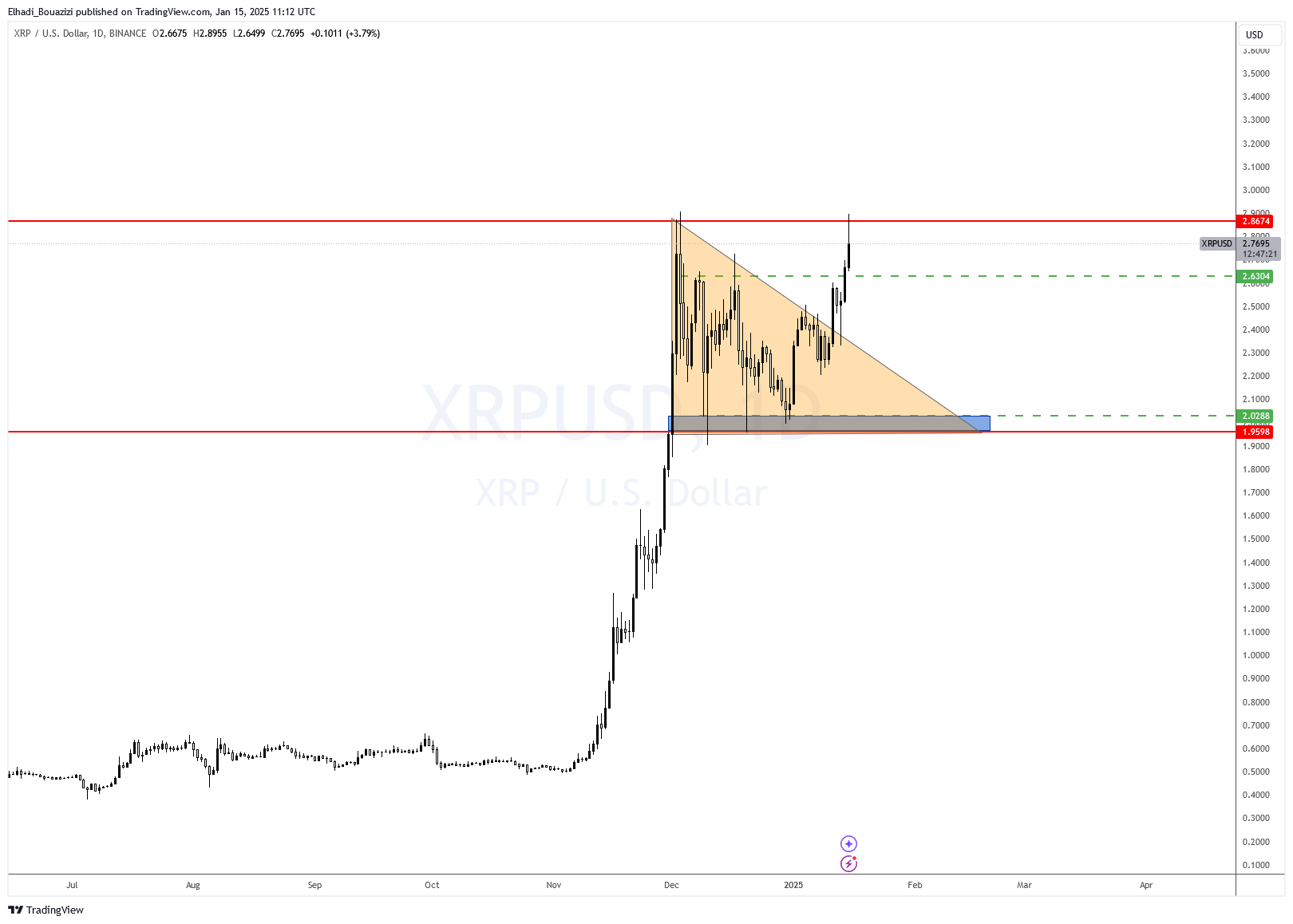 على الرسم البياني اليومي، نلاحظ أن سعر عملة XRP قد اخترق الحد العلوي لنموذج الفني المثلث الهابط، و في إشارة صعود قوية. و هو يتداول الآن تحت مستوى ثاني أعلى قمة قياسية عند 2.90 دولار. التي كان قد بلغها في بداية شهر ديسمبر الماضي.
