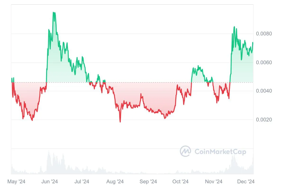 - الأيام العشرة الأخيرة من مايو 2024: لوحظت ذروة التقلبات؛ بلغ السعر ذروته عند 0.008378 دولارًا أمريكيًا في 30 مايو ولكنه انخفض إلى 0.007355 دولارًا أمريكيًا في 31 مايو، على الرغم من ارتفاع حجم التداول الذي بلغ ذروته عند 103,644,560 دولارًا أمريكيًا في 30 مايو.