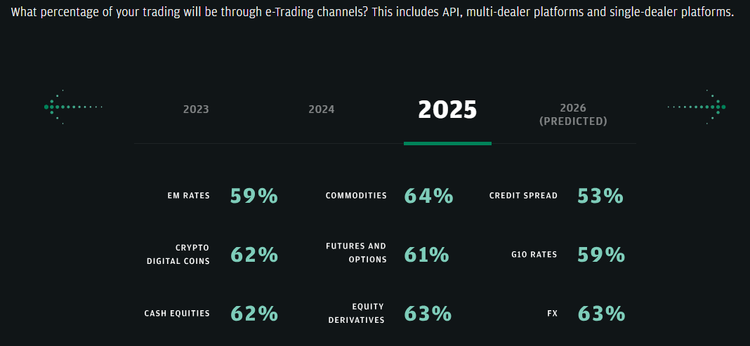 يسلط التقرير الضوء أيضًا على تغير هياكل السوق. يؤكد أن التداول الإلكتروني من المتوقع أن يتوسع عبر جميع فئات الأصول، بما في ذلك الأسواق الناشئة مثل العملات الرقمية.
