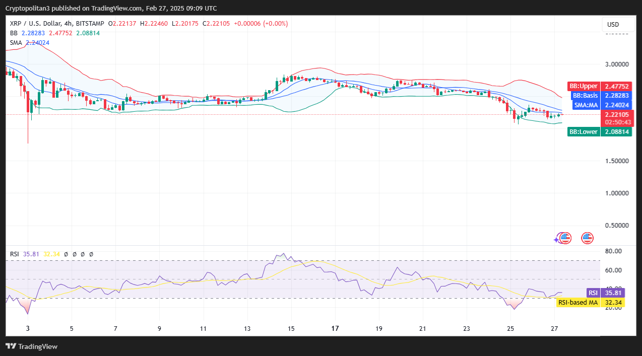 يُظهر تحليل الأسعار لمدة أربع ساعات لعملة XRP ضغط البيع العائد. انخفضت قيمة XRP/USD قليلاً إلى 2.22 دولار في الساعات القليلة الماضية. يشير التقلب المتناقص إلى فرصة أقل للانعكاس في وقت الاقتراب.