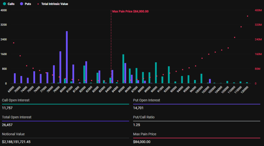 وفقًا للبيانات على ديربيت، ستنتهي صلاحية ٢٦,٤٥٧ خيار بيتكوين اليوم، وهو أقل بكثير من إغلاق الربع الأول (Q1)، حيث انتهت صلاحية ١٣٩,٢٦٠ عقد BTC الأسبوع الماضي. العقود الاختيارية المستحقة للانتهاء اليوم لديها نسبة وضع إلى نداء ١,٢٥ ونقطة ألم قصوى تبلغ ٨٤,٠٠٠ دولار.