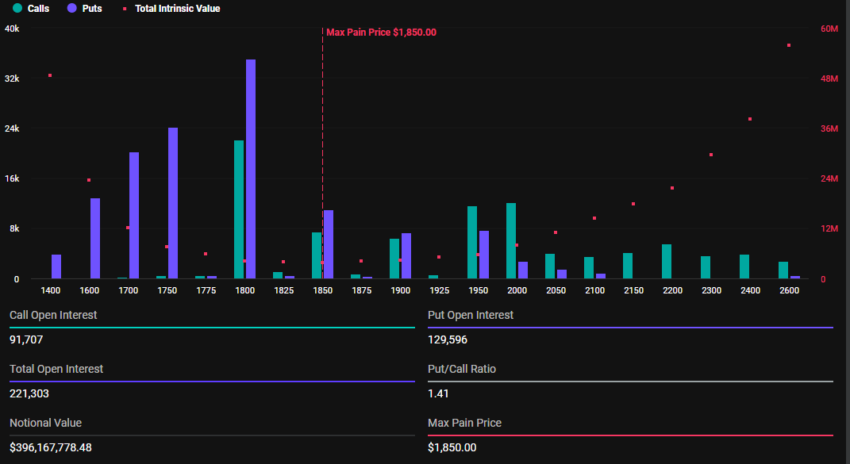 من هذا المجموع، تمثل خيارات بيتكوين (BTC) ٢,١٨ مليار دولار، بينما تمثل خيارات إيثريوم (ETH) ٣٩٦,١٦ مليون دولار.