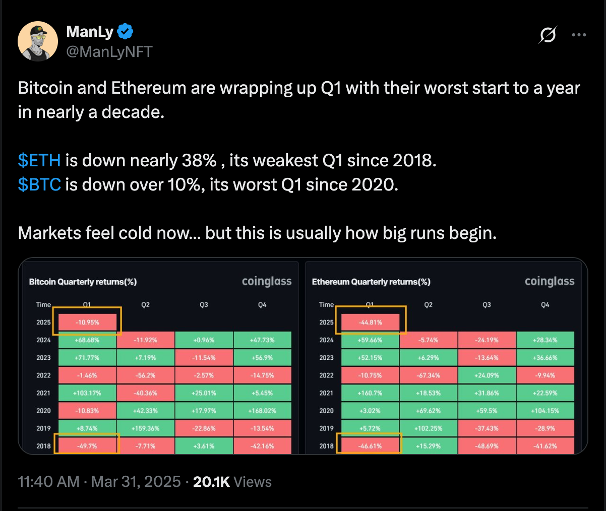 بدأ الربع الأول من عام 2025 في ظل توقعات متفائلة باستمرار الصعود، وذلك بفضل اتجاهات سوق العملات المشفرة السائدة أواخر عام 2024. وارتفع أداء سوقي بيتكوين وإيثريوم خلال الأشهر الأخيرة من عام 2024 بفضل دخول المستثمرين المؤسسيين إلى السوق، وانتشار أخبار التمويل اللامركزي الإيجابية، واستعادة تكنولوجيا البلوك تشين الاهتمام. وتوقع محللو السوق استمرار نمو الأسعار وزيادة المشاركة من العام السابق حتى عام 2025.