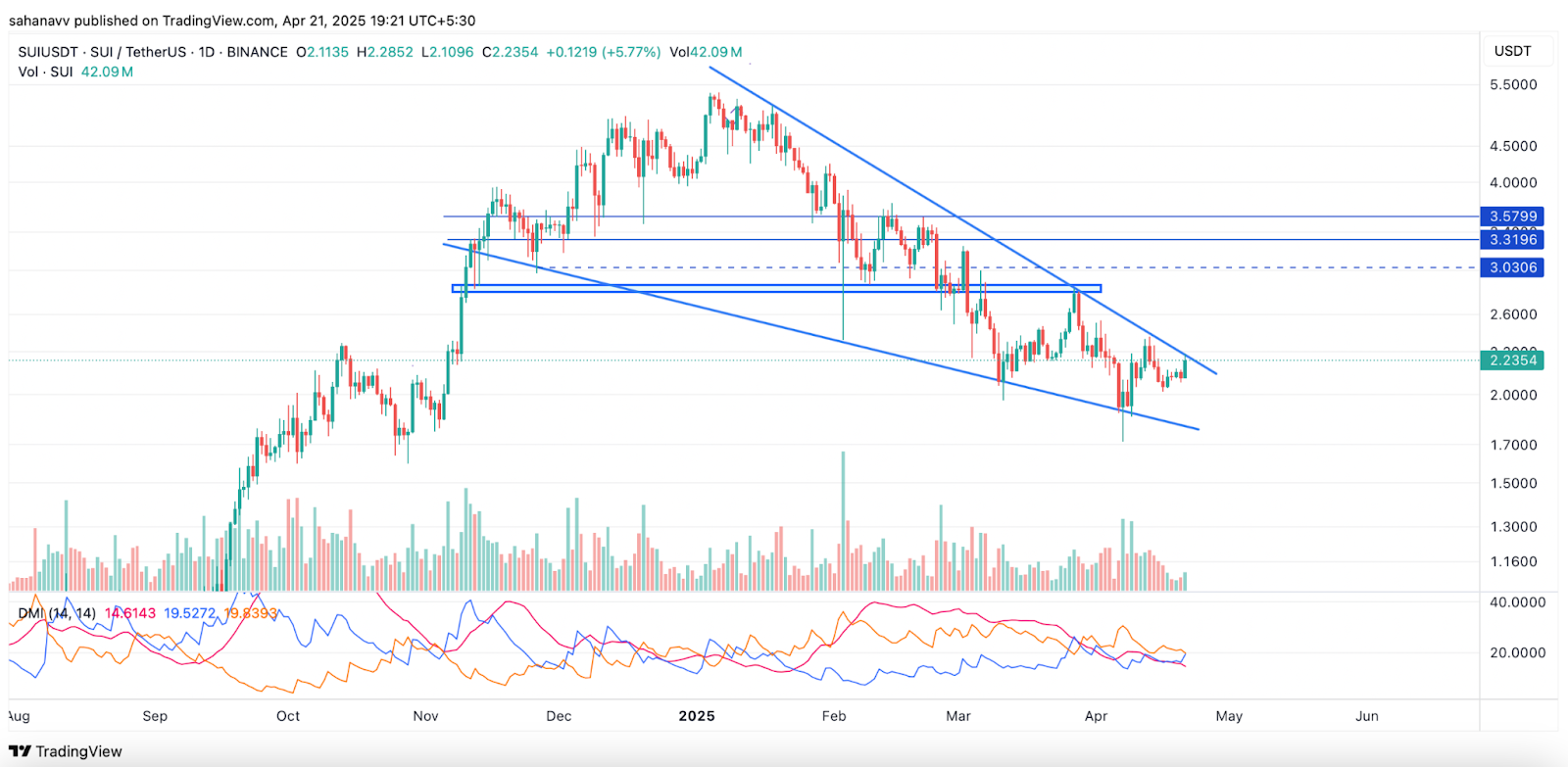 كما هو موضح في الرسم البياني أعلاه، يتداول سعر SUI ضمن نموذج إسفين هابط، ويبدو أنه وصل إلى ذروة التوحيد.