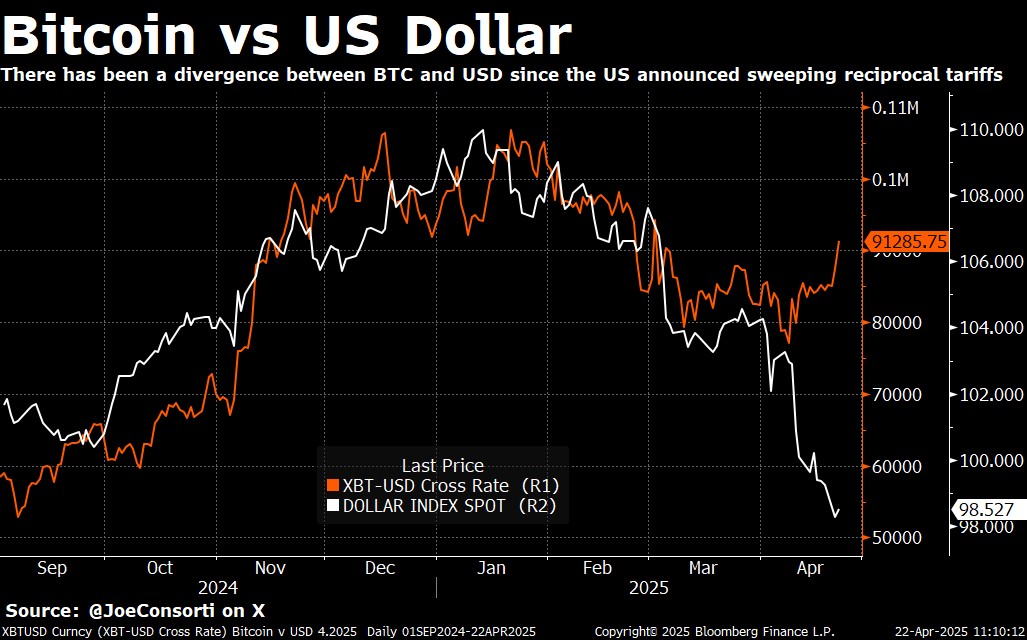 أشار جو كونسورتي، رئيس النمو في TheyaBitcoin، إلى أن بيتكوين بدأ في الانفصال عن الدولار الأمريكي بعد الإعلان عن نظام التعريفات الشامل. يظهر مخطط من منشوره أنه في أبريل، بينما انخفض DXY بشكل حاد من 103,5 إلى 98,5، ارتفع بيتكوين من حوالي 75,000$ إلى أكثر من 91,000$.