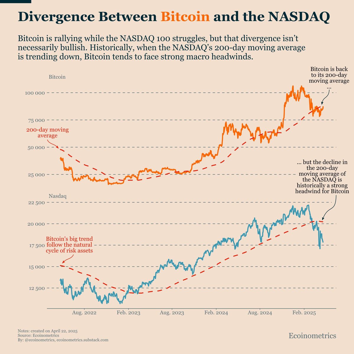 لكن في أبريل 2025، بدأت بيتكوين تظهر نموًا مستقلًا. لم تعد تتحرك بالتزامن مع ناسداك. بينما يجادل البعض، مثل إيكوينوميتركس، بأن هذا الانفصال ليس بالضرورة صعوديًا، يظل ديمستر متفائلًا.