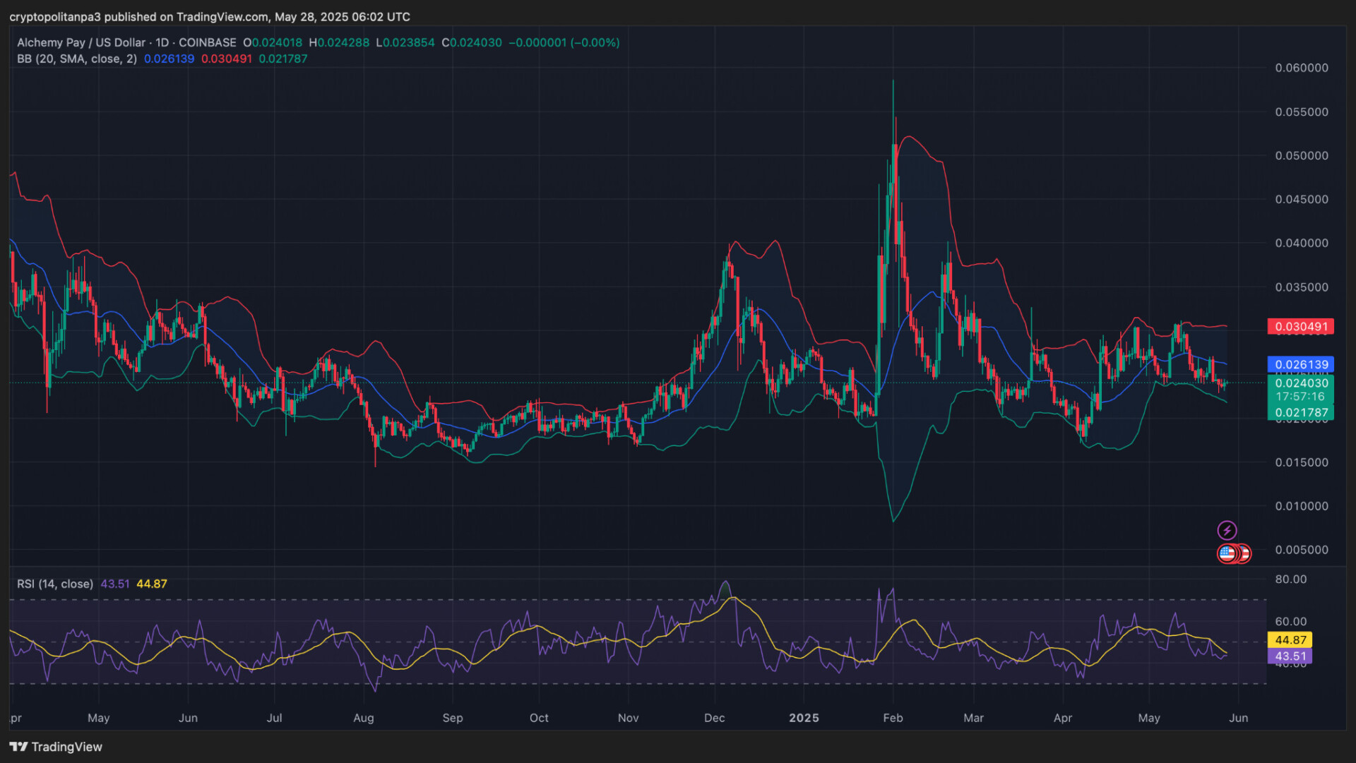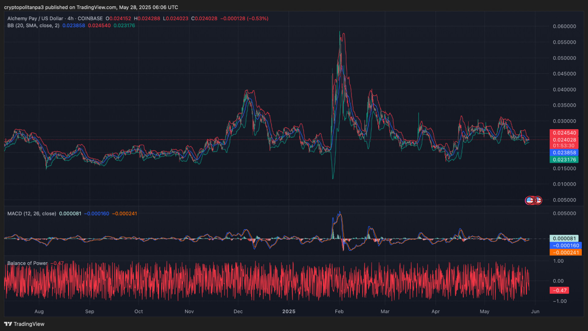 استنادًا إلى الرسم البياني ليوم واحد لـ Alchemy Pay (ACH) في 28 مايو ، يعرض الأصل نمطًا توازنًا مع تقلبات خافتة. قراءة RSI لـ 43.51 إشارات تضعف الزخم ، مما يشير إلى عدم وجود اهتمام بشراءtrong. يحوم السعر بالقرب من المنطقة السفلية من نطاقات Bollinger ، مما يشير إلى الضغط الهبوطي مع إمكانية مزيد من الجانب السلبي في حالة عدم وجود شراء كبير. يعمل النطاق الأوسط عند 0.026 دولار كمقاومة فورية ، بينما يستقر الدعم في النطاق السفلي بالقرب من 0.021 دولار. ما لم يزداد الحجم والزخم بشكل مفيد ، سيظل ACH مرتبطًا على المدى ، مع وجود أيdent في أحداث معنويات السوق أوسع أوسع في السوق.